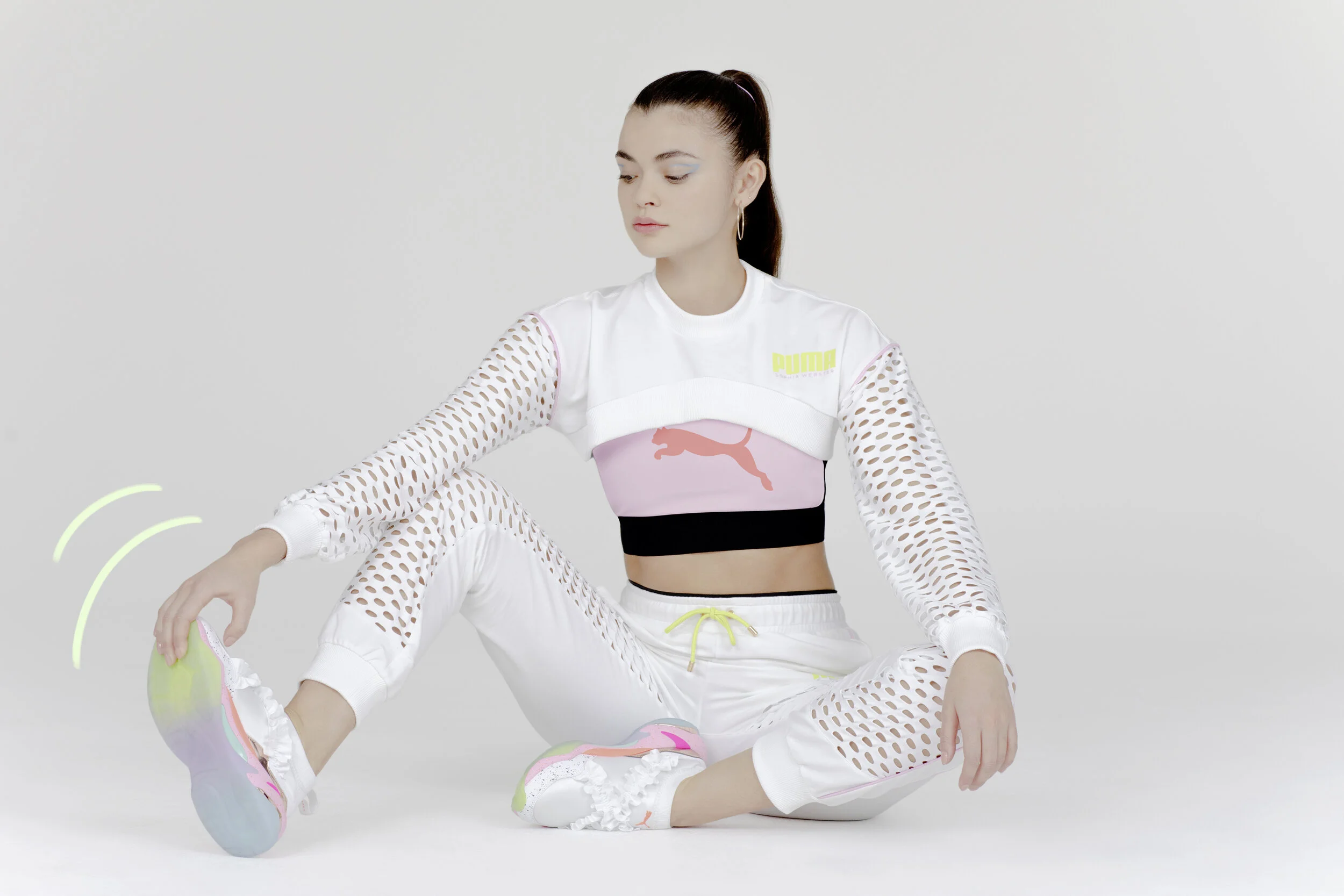 British footwear designer Sophia Webster and her cult following are on the rise. Her hand-drawn designs have been translated into heels, flats, and espadrilles with bold hues and attitude, and have been worn by fashion icons the world over. For the third season of PUMA x SOPHIA WEBSTER, sparkly meets sophisticated in vibrant designs that draw inspiration from ‘80s workout and dance gear. PUMA silhouettes are transformed with new logos, bold prints, and ‘80s-inspired colorblocking in a collection made for the baddest babes out there.